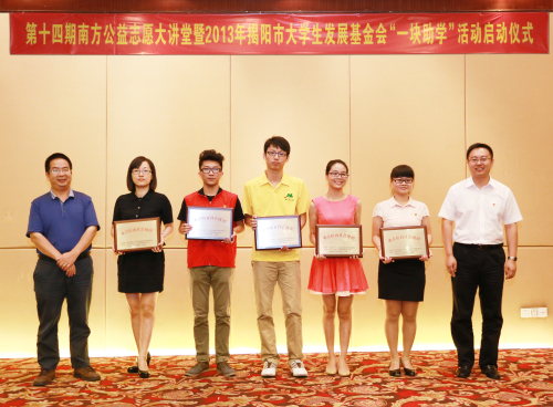 中国青年志愿者网讯 8月24日,由团省委、省文明办、省民政厅、南方报业传媒集团、广东电视台主办,省志愿者联合会、团揭阳市委、揭阳市文明办、揭阳市民政局、揭阳日报社、揭阳广播电视台、揭阳市志愿者协会承办的第十四期南方公益志愿大讲堂暨2013年揭阳市大学生发展基金会“一块助学”活动启动仪式在揭阳举行。为传播先进公益志愿理念,宣传推广“社工+义工(志愿者)”联动工作模式,本期大讲堂向香港社会工作人员协会荣誉会长吴水丽先生颁发了“南方公益志愿大讲堂导师”聘书,并邀请其作题为“发展义工的五个纬度:社会工作的角色”的主题演讲。来自揭阳市各类社会组织、社工机构、志愿者组织负责人、志愿者骨干、捐资企业代表、青企协会员以及揭阳市大学生发展基金会受助学生共约200多人到场聆听讲座。