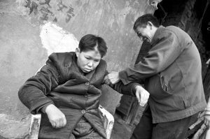 杨秀兵每天都要为瘫痪多年的妻子周素英按摩,进行恢复性训练 本报记者石涛 摄