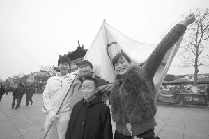 在夫子庙,市民与五环旗合影。本报记者 张华 摄