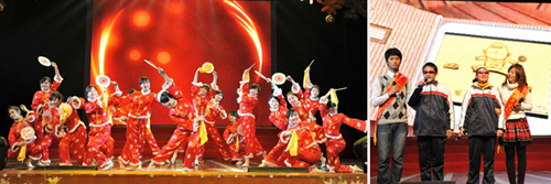 在颁奖礼进行的同时,穿插精彩节目,充分展示了湖北青年志愿者的魅力,构成另一道靓丽的风景。“携手是心灵能凝聚,携手是力量能凝聚……”获得湖北志愿者公益歌曲创作演唱大赛一等奖的原创歌曲《携手》由湖北师范学院的四位志愿者倾情演唱,悦耳动听的歌声感染了在场的所有观众。青春靓丽的T台秀则把湖北志愿者形象设计大赛的优秀作品展示在了舞台之上,湖北志愿者吉祥物“楚楚”首次登台亮相,清新可人的形象备受青睐,与现场观众的搞怪互动更是让人捧腹。精彩纷呈的表演节目次第上演,把会场气氛一次次推向高潮。华中农业大学艺术团表演的舞蹈《情醉女儿鼓》和管乐合奏《春之韵》,武汉市盲校学生程前和志愿者合作表演的歌曲《你是我的眼》,以及湖北第二师范学院志愿者的朗诵《感恩》,通过与背景LED彩屏和舞美灯光的配合,相映生辉,营造出绚烂的舞台效果,让人目不暇接,也让观众们感受到了青年志愿者们的平凡与感动。一名现场观众在看完表演后深有感触:“志愿者们很不容易,默默无闻,无私奉献自己的青春和才华,他们的精神值得我们每一个人去学习。”最后,活动在主持人慷慨激昂的致辞中落下帷幕。