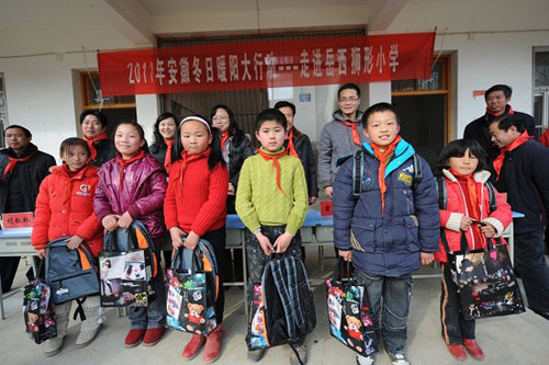 此次“2011年安徽冬日暖阳大行动——走进安庆岳西狮行小学”公益活动,是由安徽省工商局、安徽省红十字会主办,安利安徽分公司承办的,活动当天,活动主办单位向岳西县狮形小学捐赠了价值1万元的课桌椅和20台电脑,并对该校10名贫困学生进行了学习用品捐赠,当受赠学生背着爱心书包,拿着安利公司捐赠的学习用品时,可爱的小脸上都洋溢着幸福的微笑,他们说一定要好好学习,来报答大家对他们的关心。