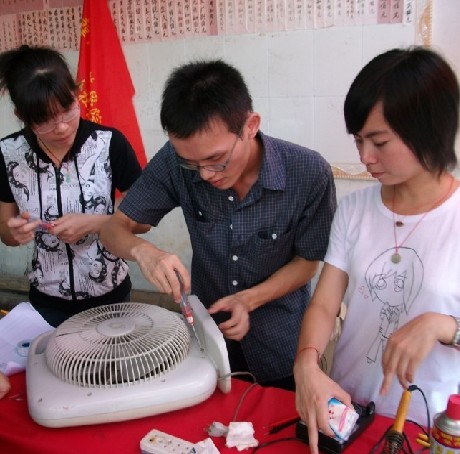 夏日的骄阳并不能降低队员们探究、实践的热情。调查研究组成员通过纸质问卷和口头访谈的方式深入村民家中进行调查,并得到当地群众的大力支持。本次实践活动通过实地调查,目的是了解当地精神文化生活情况及其需求,以促进当地的文化发展。而义务维修组则在新联村附近拉起宣传横幅,设点进行家电、电脑等义务维修,并向当地村民宣传一些安全用电等科学知识,以促进当地科技文化发展,推动共建和谐互助的乡村。很多村民都搬来需要维修的家电,对此次活动给予了极大的支持,而义务维修组的成员都以认真负责的态度做好维修工作。