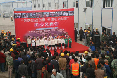 活动在同心实验小学同学们美丽的舞蹈中拉开帷幕,同学们精彩的舞蹈和优美的歌声引来了500多名施工人员前来观看,一遍又一遍的掌声将活动推向高潮。演出完毕后,义卖会正式开始,同心实验学校的同学们和中建三局北京公司青年志愿者们当起了导购员,现场施工人员积极响应,踊跃参加义卖活动,购买自己所需物品,献出一片爱心。