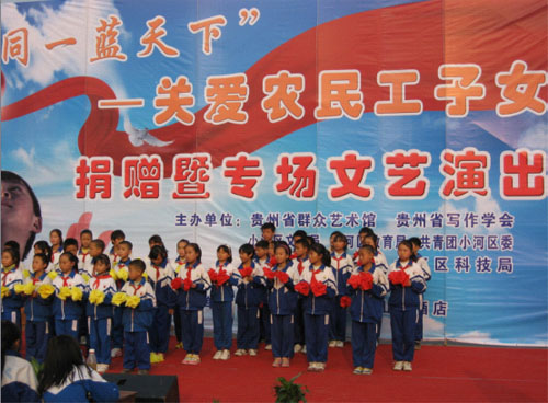 贵阳市,由省写作协会、省群众艺术馆、共青团小河区委等多家单位在小河区三元小学联合举行了“关爱农民工子女捐赠暨专场文艺演出”。500多名师生参加了捐赠和演出活动并观看了歌舞、武术、魔术等表演,每位农民工子女还领到了学习用品、体育用品。活动中,省写作协会的专家们还为三元小学农民工子女学生赠送了书法作品。