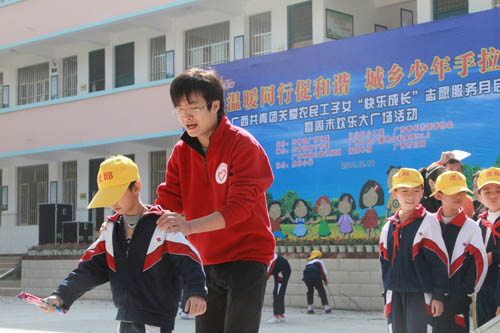 仪式结束后,参加活动的志愿者与虎邱小学的农民工子女共同开展了 “周末欢乐大广场活动”,共有来自社会各界的130名志愿者参加。志愿者们不但给小朋友们赠送礼物,跟他们一起表演节目,一起玩滚铁环等游戏,还请来派出所的民警为大家上了一堂安全教育课。丰富有趣的节目和游戏、志愿者和小朋友的真情互动,让活动现场气氛快乐轻松,小朋友们忘了平日的烦恼,脸上露出了灿烂的笑容。他们都希望能多参加一些这样的活动。据了解,这次“快乐成长”志愿服务月活动不仅是团广西区委深入开展关爱行动的重要内容之一,也标志着全区新一轮关爱农民工子女活动正式启动。共青团广西区委希望通过这类活动唤起社会各界对农民工子女更多的关爱,发挥社会各界的力量特别是媒体和民间公益组织的优势,扩大关爱行动的社会影响力,使更多的农民工子女能够在社会的关爱下健康成长。同时,也希望能在活动中不断探索出关爱行动的新模式和长效机制。