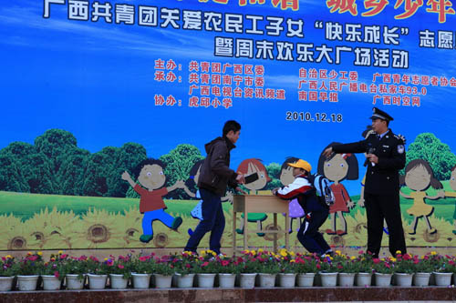 12月18日上午,“温暖同行促和谐城乡少年手拉手”广西共青团关爱农民工子女“快乐成长”志愿服务月启动仪式在南宁市虎邱小学举行。作为“心手相牵助成长——广西共青团关爱农民工子女志愿服务行动”的重要组成部分,本次志愿服务月活动重在突出“快乐成长”,组织动员以青年志愿者为主体的社会各界热心公益事业的人士,在元旦和春节期间为农民工子女送去更多的关怀,通过设计一系列丰富多彩的关爱活动,努力为广大农民工子女营造快乐轻松的成长环境。活动由共青团广西区委、广西少工委、广西青年志愿者协会联合主办,广西人民广播电台、广西电视台、南国早报、广西时空网等协办单位以及八桂义工、安利志愿者组织等民间公益组织的代表也参加了当天的仪式。