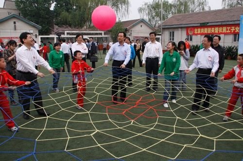团中央书记处第一书记陆昊(中)、北京市委常委梁伟(左二)、北京林业大学党委书记吴斌(右二)、林大的志愿者与农民工子女一起玩网抛大球团队合作游戏