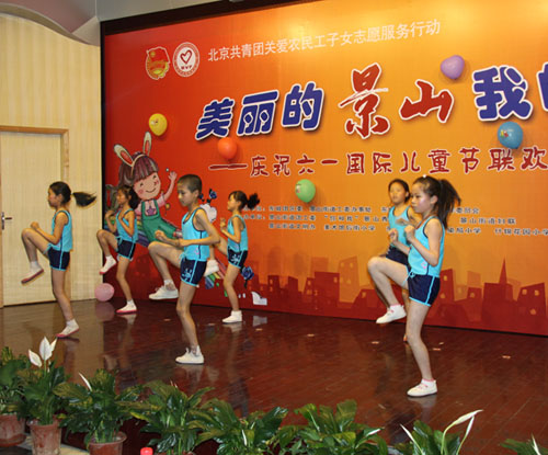 6月1日下午,“美丽的景山我的家”庆祝六一国际儿童节联欢活动在景山街道办事处礼堂举行。团中央书记处书记周长奎,北京团市委书记王少峰,东城区委书记杨柳荫,团中央青年志愿者工作部副部长郭平,东城区委常委、组织部部长吴松元,北京市志愿服务指导中心主任郭新保等领导同志参加活动,与“你和我”景山青年志愿者联盟志愿者代表、景山街道驻地四所小学的近百名农民工子女共度第61个“国际儿童节”。