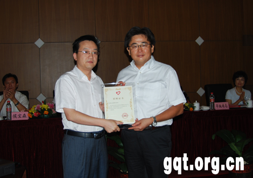 团中央青年志愿者工作部部长陈光浩向东京海上控股株式会社代表早坂靖志颁发捐赠证书