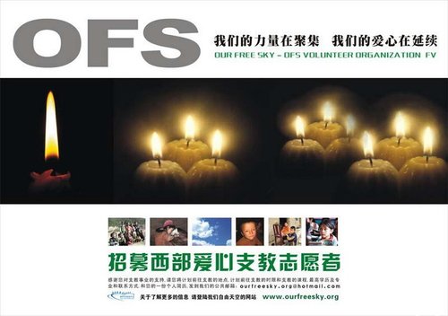 “我们的自由天空”(OurFreeSky,OFS Volunteer Organization)公益助学项目组是由来自全国各地以及海外华人,由“我们的自由天空”广大爱心志愿者联合发起的,广泛吸收社会各界爱心人士自愿结成的、非营利性的志愿者组织,组织以网站 www.ourfreesky.org 作为公益、助学帮困活动开展及志愿者间交流的共同平台。网站创立于2006年3月,至今已有20000余名注册会员。
