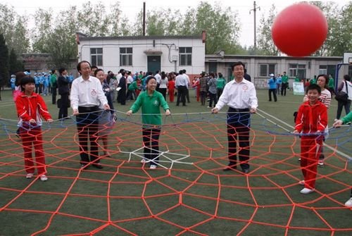 团中央书记处第一书记陆昊(中)、北京市委常委梁伟(左二)、北京林业大学党委书记吴斌(右二)、林大的志愿者与农民工子女一起玩网抛大球团队合作游戏