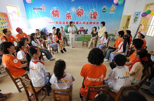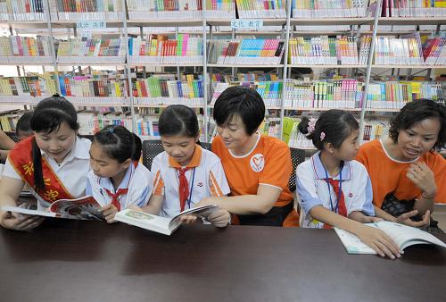 5月27日,在广西南宁市西乡塘裕兴学校,爱心志愿者在“阳光图书馆”和孩子们一起阅读。当日,关注流动儿童的公益项目——“阳光计划”在广西南宁市西乡塘裕兴学校落户。该计划为该校近千名农民工子女捐建了一个拥有上万册藏书的“阳光图书馆”,爱心志愿者还通过和孩子们一起阅读、讲故事,组织孩子们参加社会公益活动等方式,将温暖送给农民工子女。“阳光计划”是由全国妇联、中国儿童少年基金会和安利(中国)日用品有限公司共同推出的、针对流动儿童的大型素质教育援助公益项目。该计划2008年在北京启动,并在全国15所农民工子弟学校试行,2009年将在全国新增10所试行学校。