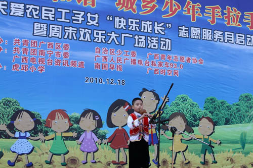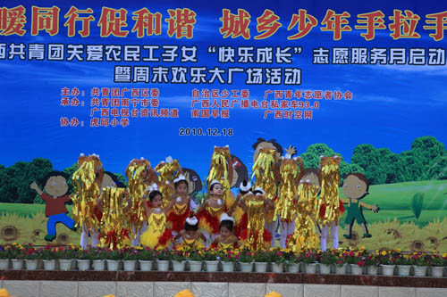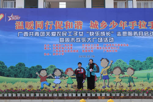 12月18日上午,“温暖同行促和谐城乡少年手拉手”广西共青团关爱农民工子女“快乐成长”志愿服务月启动仪式在南宁市虎邱小学举行。作为“心手相牵助成长——广西共青团关爱农民工子女志愿服务行动”的重要组成部分,本次志愿服务月活动重在突出“快乐成长”,组织动员以青年志愿者为主体的社会各界热心公益事业的人士,在元旦和春节期间为农民工子女送去更多的关怀,通过设计一系列丰富多彩的关爱活动,努力为广大农民工子女营造快乐轻松的成长环境。活动由共青团广西区委、广西少工委、广西青年志愿者协会联合主办,广西人民广播电台、广西电视台、南国早报、广西时空网等协办单位以及八桂义工、安利志愿者组织等民间公益组织的代表也参加了当天的仪式。
