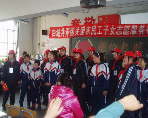 近一年来,白城各级团组织广泛动员大中专院校、机关企事业单位以及社会各方面的青年志愿者,整合团内资源和社会资源,通过青年志愿者与农民工子女结成帮扶对子的方式,以学业辅导、亲情陪伴、自护教育、爱心捐助等为主要内容,帮助农民工子女进步成长成才,与农民工子女共结成帮扶对子858对。