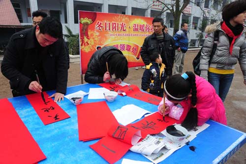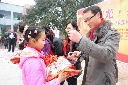 写春联、过集体生日、煮汤圆、做丢手绢游戏、跳兔子舞、送礼物……1月13日,古昌镇中心小学内笑声朗朗、热闹非凡,2011年重庆市共青团关爱农村留守儿童活动在这里拉开帷幕。不仅在寒风凛凛的冬日为农村留守儿童送去了礼物和关爱,还开展了少先队志愿辅导员代表走进中队“送关爱、送文化、送科技、送培训、送活动、送春联、送祝福”的活动。