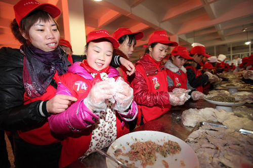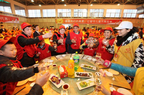 百家宴开始前,留守儿童和爸爸、妈妈一起包饺子、做蛋糕,大家忙得不亦乐乎,满脸是甜蜜的微笑,余远牧副主任、赵公卿会长受此情此景感染,也加入到了包饺子、做蛋糕的行列,余远牧副主任还饶有兴致的提起毛笔和留守儿童一起写起了春联。宴会上,专门安排了“唱读讲传”节目演出,歌舞《玉兔迎春》热闹喜庆、诵读《理想》催人奋进、情景剧《冬日阳光》一声“妈妈”喊哭孩子和家长,感动了在场的每一个人。晚宴上,孩子吃到了自己包的饺子和精美的菜肴,每道菜都有一个温馨名字,如腊香肠取名“心心相连”、苦瓜取名“忆苦思甜”、糯米排骨取名“春满人间”、虾排取名“和谐之家”……百家宴的菜品有21道菜和1个果拼。晚宴中,还安排了抽奖活动,全场设一等奖20个、三等奖30个、三等奖50个,每个留守儿童都有奖。除了每人都有一个奖以外,还给每个留守儿童发放了一个新年礼包,礼包中包括浴巾、饭盒、水壶、旺旺奶糖、兔年吉祥物等礼物。