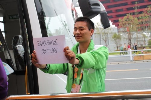 志愿者们一边维护乘车队伍的秩序,一边耐心的解答候车者的各种问题。遇到各种口音的外国参观者,他们还要不时的切换成英文,辅以大量手势,清楚的传达路线情况。