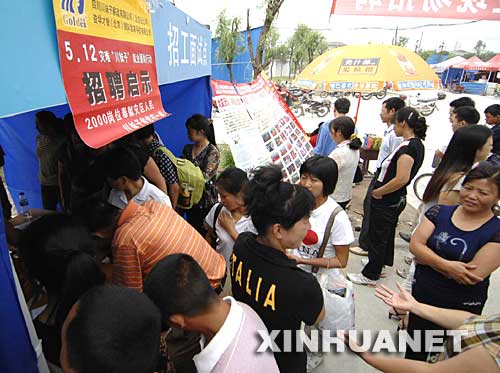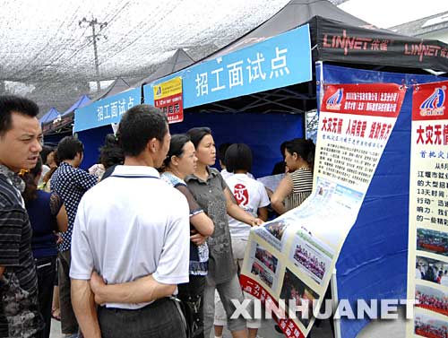 都江堰市的受灾群众在招聘会上了解用工信息。