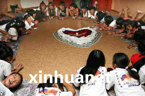 8月4日,在俄罗斯“海洋”全俄儿童中心,来自中国四川地震灾区的孩子们和俄罗斯辅导员共同参加烛光晚会。