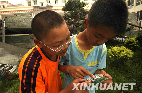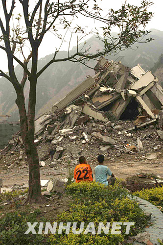 汶川县映秀镇漩口中学初一学生董学松(右)和苟智东看着成为一片废墟的校园。四川汶川县映秀镇漩口中学在地震中严重受损,一些同学回到被毁坏的学校,回忆昔日的校园生活。