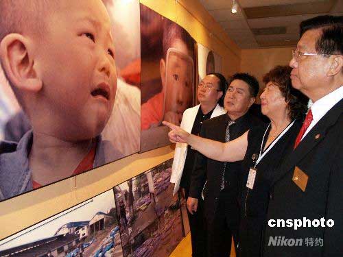 6月14日,“中国汶川大地震图片巡回展”在美国洛杉矶举行,共展出活灵活现四川受震悲惨镜头及灾民奋勇抗灾的难忘画面共120多幅珍贵照片,图片巡回展旨在“感动美国,救援灾区”。图右起蒙特利公园市议员刘达强、世界华人华侨总会副主席姜华等被一张“地震中的小男孩”照片所吸引。