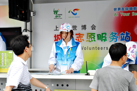 服务站的美女志愿者正在耐心的回答游客的咨询。