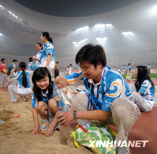 9月17日,残奥会闭幕式结束后,一名志愿者在收集“鸟巢”沙坑里的沙子作纪念。