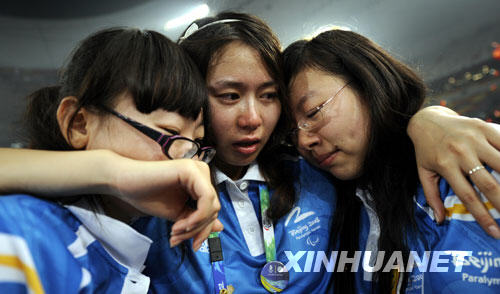 9月17日,残奥会闭幕式结束后,三名志愿者在“鸟巢”依依惜别。