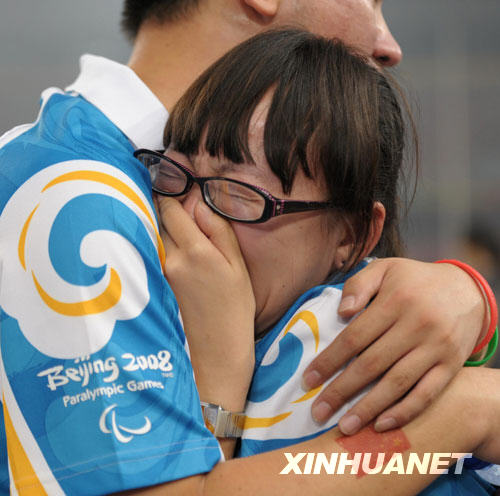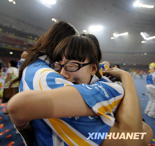 9月17日,残奥会闭幕式结束后,两名志愿者在“鸟巢”依依惜别。