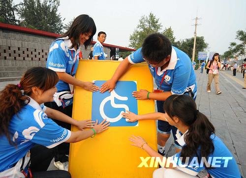 9月17日,几名城市志愿者在北京地铁北土城站摆放无障碍通道标志。
