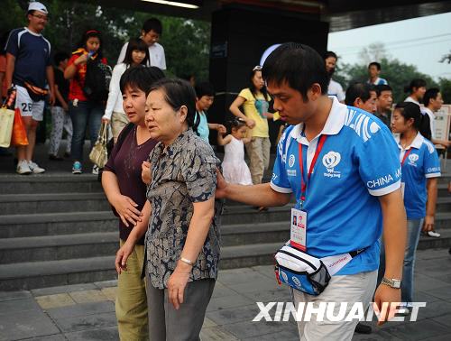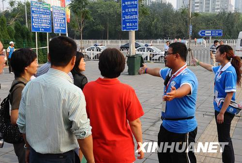 9月17日,几名城市志愿者在北京地铁北土城站为前来观看残奥会闭幕式的观众指引路线。