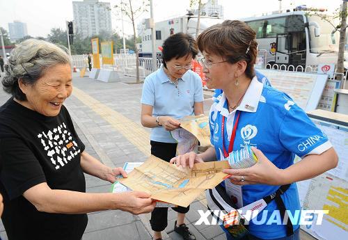 9月17日,一名城市志愿者在北京地铁北土城站熊猫环岛站点向观看闭幕式的观众介绍奥林匹克中心区的情况。当日,北京2008年残奥会闭幕式将在国家体育场“鸟巢”举行。北京40万名城市志愿者从7月1日开始奋战了79个日日夜夜后,依然用最饱满的热情和最真诚的微笑,服务在全市各个角落,用温馨的服务和即将结束的奥运告别。