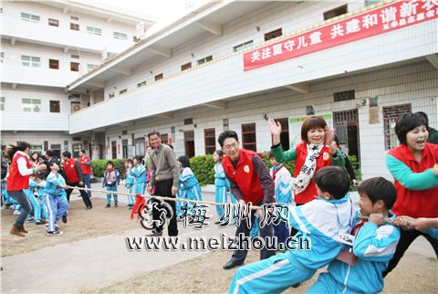 12月30日,五华县志愿者联合会与爱童行服务队、黄井热心青年服务队一行20多人,到该县水寨镇黄井小学与100 多名留守儿童联欢迎新年。他们与留守儿童一起开展老鹰抓小鸡、捉迷藏、兔子弹丸赛、呼拉圈合作赛、双人扛气球运动、拔河比赛(如图)等游戏。黄井热心青年服务队还捐资6000 元给学校购置了队鼓,并为留守儿童送上了庆贺新年的布娃娃和文具、学习用品。
