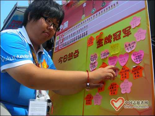 宣武区牛街社区,每天来到站点参加活动的社区青少年非常多,其中不乏小“体育迷”。针对这种情况,站点的志愿者开展了“我和冠军比生日”的活动,每当中国队获得一枚金牌,志愿者都会把冠军的生日、介绍写在心形的彩纸上贴上留言板,让孩子们了解。“我们开展的这些特色服务活动,主要是为了通过孩子们喜爱的形式,让孩子们了解奥运冠军、学习奥林匹克更高更快更强的精神,鼓励他们积极进取、勇于攀登。”城市志愿者对记者说。