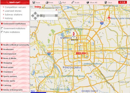 奥运官方网站上推出的英文版奥运地图服务,覆盖了北京市的全市地区。根据多年地图搜索经验和对外国人查询信息的调查分析,目前推出的地图服务包括4个热点信息的专题地图和12个分类信息的专题地图。热点信息专题地图包括比赛场馆、特许商店、地铁站和精品胡同4个地图查询服务。另外12个分类信息的专题地图,其中包括政府机关、医疗卫生、学校科研、休闲娱乐、新闻媒体、购物场所、房地产、场馆会所、体育场馆、旅游景点、餐饮服务以及宾馆饭店。