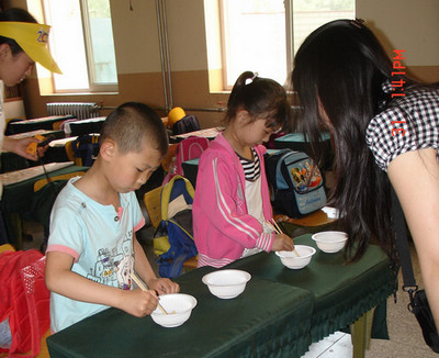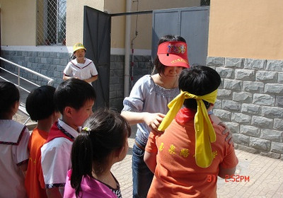 经过一个多小时的辗转,志愿者队伍终于抵达玉泉路小学,该校师生热情欢迎志愿者的到来。简单的交接仪式之后,来自我校的志愿者在学院带队老师的带领下,兴致勃勃的与小朋友们玩起了游戏。在“盲人击鼓”、“夹球进桶”、“猜字谜”等游戏里,小朋友们和志愿者们打成一片,在益智健身的同时也感受到了来自大学生志愿者对他们的关爱和期望。