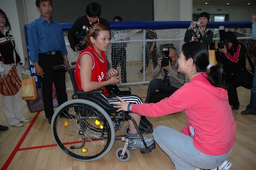 5月29日是北京残奥会倒计时100天,数万名残奥会志愿者厉兵秣马,全力准备投入残奥会志愿服务。这是在北京市残疾人体育训练和职业技能培训中心,一位残奥会志愿者(右)正与备战残奥会轮椅篮球的运动员进行交谈。