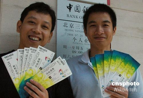 8月15日,2008年北京残奥会体育比赛门票在北京地区的30个中国银行门票代售网点销售,并提供现场打印门票服务。公众持有效身份证件在代售网点排队实时购票,每人每次最多买2个场次共10张门票。目前共有205个比赛场次80万张比赛门票供销售,购票时间截至到9月17日。图为来自广东的民众高兴地买到残奥会门票。