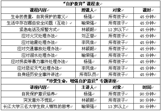 (一)根据农村需要,改进自护教育课程。结合农村生产生活常发意外情况,根据当地气候、地况特征,西南科技大学“爱启航”大学生志愿服务团队多次进行培训方案研讨,邀请专家对方案进行指导和修正,设置了涵盖自然灾害、意外事故、暴力犯罪等情况的自护培训课程,并精心准备了三场家长和学生共同参与的农村生活自护技能专题讲座。