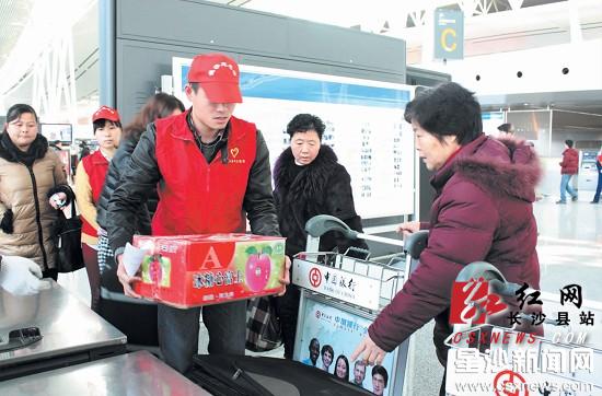 图为大学生村官志愿者正在帮旅客搬运行李。江蓝 摄