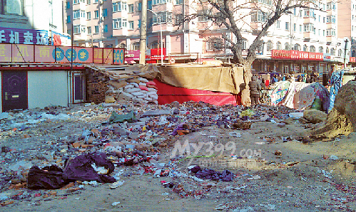 根据读者反映的情况,昨天上午,记者来到道外区南十六道街和仁里街街口,记者看到,一排板房和木棚搭成的商亭及用彩色塑料苫布包裹的小房,沿着南十六道街摆开。就在这些商亭缝隙中,能够清楚地看到各种颜色塑料袋、纸屑、生活垃圾、沙土等。记者绕过这些简易商亭和堆积物,看到了一条10米左右的垃圾带,垃圾集中的地方有二十平方米左右,堆积着建筑垃圾袋、生活垃圾、废弃衣物等垃圾,垃圾堆起一米多高。位于垃圾堆下面的很多垃圾已经和泥土冻在一起,看上去堆积了很久,风吹起时,尘土带着垃圾堆上的塑料袋和纸屑沿着南十六道街板房、商亭等一路飘飞。