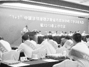 张秀夫在今天召开的“1+1”中国法律援助志愿者行动2009年总结表彰暨2010年工作会议上介绍说,2009年7月开始的“1+1”行动,当年共选拔、派遣了100名志愿者到70个县开展法律援助服务。一年中,广大志愿者上山下乡,进村入户,尽心竭力为困难群体提供法律援助,维护他们的合法权益,律师志愿者在服务期内人人超额完成办案任务;他们牢固树立大局意识,积极协助当地党委、政府化解社会矛盾,妥善处理了几十起涉及社会保险、拆迁安置、征地补偿等方面的群体性纠纷和涉法涉诉信访案件;律师志愿者在做好法律援助服务的同时,还义务担任政府法律顾问,运用法律知识,提出合乎法律规范的建议,促进了政府依法管理社会事务并广泛参与基层普法宣传,深入工厂、社区、学校、乡镇、集市等开展法制宣传讲座近百场,授课人数达两万多人次,在基层播撒了法律的种子。