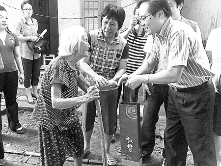 本报讯 (记者 高丹丽)9月14日下午, 30多名志愿者和爱心企业海口喜来登度假酒店的员工代表在团市委的带领下来到了美兰区演丰镇敬老院,慰问在这里生活的21名孤寡老人,为老人们送去了爱心月饼和中秋的祝福。