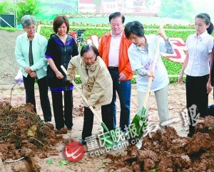 昨天上午,全国政协原副主席谢觉哉的夫人、百岁老红军王定国一早来到江北区五宝镇。老人看上去身体很好,面容清瘦慈祥。她和大家一起,一边在薄雾中观看中央电视台的直播,一边种树。