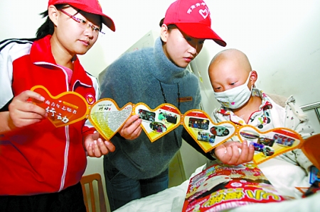 10月19日,“关爱小天使”志愿服务队的志愿者在省肿瘤医院血液科青少年白血病患者病床前,与他们结对子、交朋友。本报记者 王铮摄