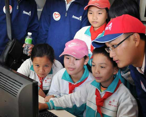 12月27日,志愿者帮助孩子们使用捐赠的电脑。