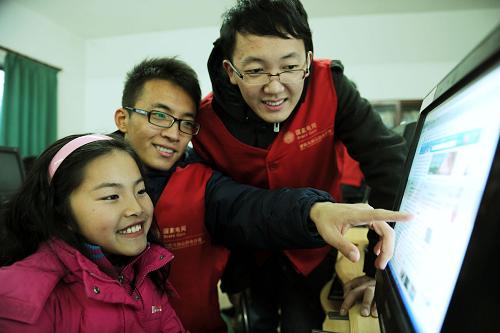 12月28日,志愿者常舜禹(右)、刘吉波(中)在教福利院儿童马姿伟上网。