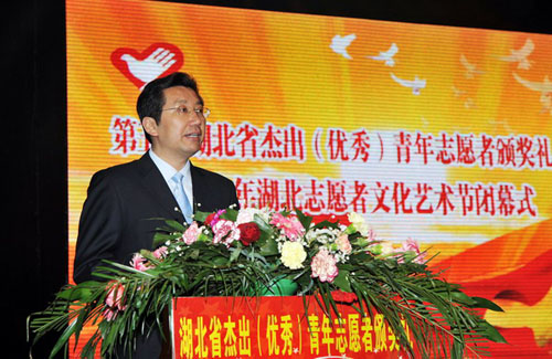 12月29日下午,由团湖北省委、省志愿者协会主办的第五届湖北省杰出(优秀)青年志愿者颁奖礼暨2010湖北志愿者文化艺术节闭幕式在华中农业大学大学生活动中心剧场隆重举行。省人大副主任蒋大国出席并讲话,省委宣传部副部长李子林、华中农业大学党委副书记唐骏以及省委组织部、文明办、省人社厅、省教育厅、省民政厅等相关负责人参加了活动,活动由团省委副书记、省志愿者协会理事长陈正祥主持。全国道德模范、武汉市武昌区政府原巡视员吴天祥,中国青年志愿者协会副会长、04年感动中国十大人物、中国十大杰出志愿者徐本禹,省移动公司、完美(中国)湖北分公司等单位负责人,各高校、企事业单位团委书记、志愿者工作负责人及志愿者骨干代表1000余人参加了活动。