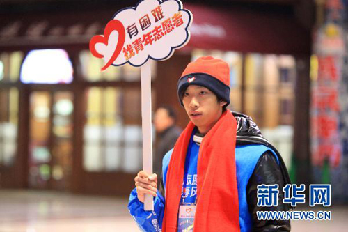 1月27日,春运志愿者在北京火车站为乘客提供服务。自铁路春运工作启动以来,北京站设立青年志愿者服务队,他们手持“有困难找青年志愿者”的标语,每天最晚一班岗到21:30,为春运增添了一丝温暖。