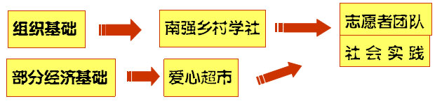 在建成几所乡村图书馆以后,为了把这一活动继续开展下去,我们成立了南强乡村学社作为组织的基础,以学社的名义来募集志愿者团队和展开活动。同时,团队的一部分成员接手校内的爱心超市,作为日常募集图书的活动地点,开展一些代卖义卖活动,为乡村图书馆的建设筹集一部分资金。在南强下乡村学社和爱心超市成立后,到目前为止我们又建立了古田馆、平潭馆等4所图书馆。现在社团经历6载,传承到我们手中,我们将继续坚持社团宗旨,把我们的想法落实到新农村建设上来,勇担责任,为促进农村文化的发展贡献我们的力量,同时,用我们的行动来带动更多人的爱心行动,使全国农村文化建设形成规模,整体提高农村的生活质量。